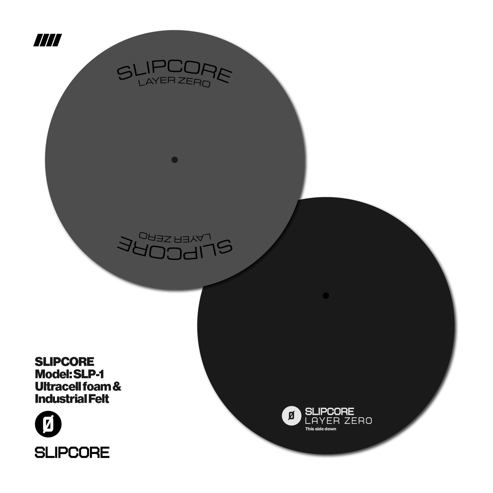The flagship Slipcore edition, futurism encapsulated in a slipmat. The SLP1 completely redefinies the slipmat and is for everyone and every style. This 12-inch platter of Ultracell foam core is based with compressed industrial 3mm felt, creating a dense-yet-sleek disc that absorbs vibration and maximizes cushion for your vinyl. Foam side up for that signature “hover” feel and cushy touch, giving your wax the best bed it's ever had to rest on.